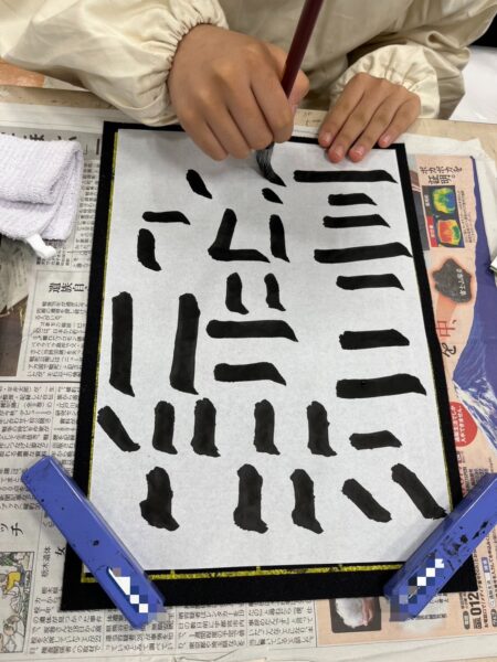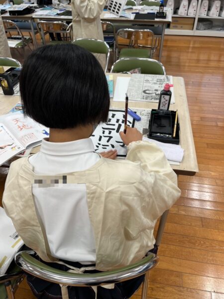 中1では後期から書道の授業が始まりました。書道の授業は地下にある書道室で行われます。